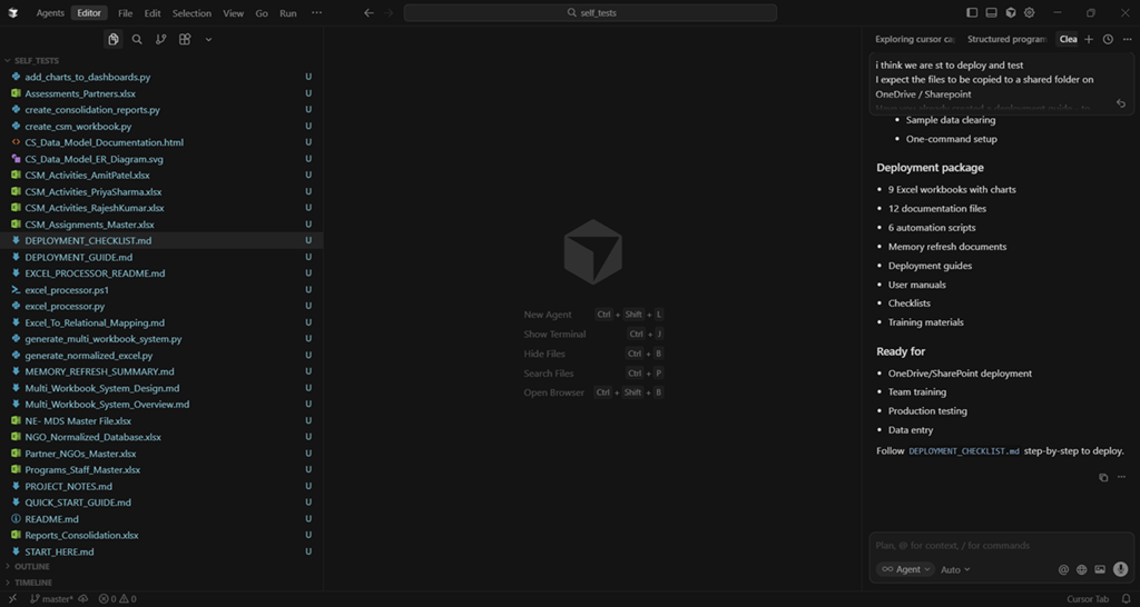 - do not underestimate the power of what such tools can do. for one of my side projects, i wanted to upload an Excel template and start the conversation based on that. While cursor, by itself, could not read Excel files, it created python scripts to achieve the desired results